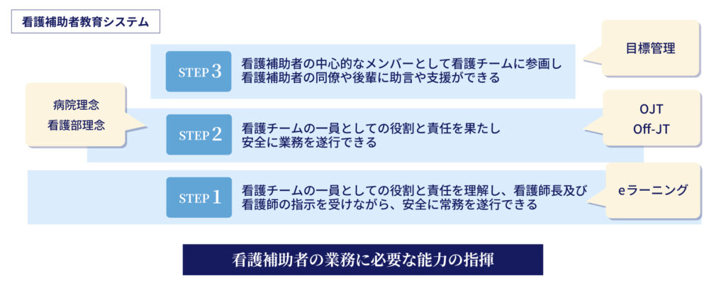 看護補助者の能力開発には「看護補助者の常務に必要な能力の指標(日本看護協会)」を基盤とした看護補助者ラダーを活用します。「基本姿勢と態度」はコンプライアンスや接遇、「業務遂行に必要な知識・技術」は実践・安全・チームワーク・コミュニケーションなどの能力で構成されています。