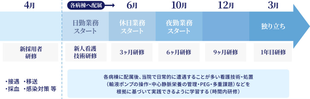 病院理念、看護部理念に基づき、質の高い看護・介護を提供できる看護職員を育成する
