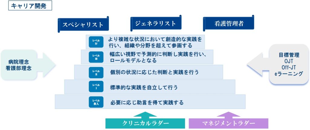 能力開発にはクリニカルラダー、マネジメントラダーを活用するとともに、ラダーに沿った研修計画を立案実施します。
